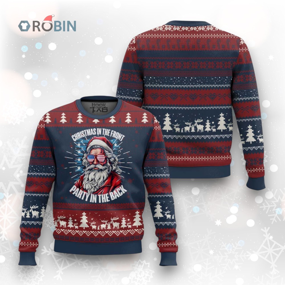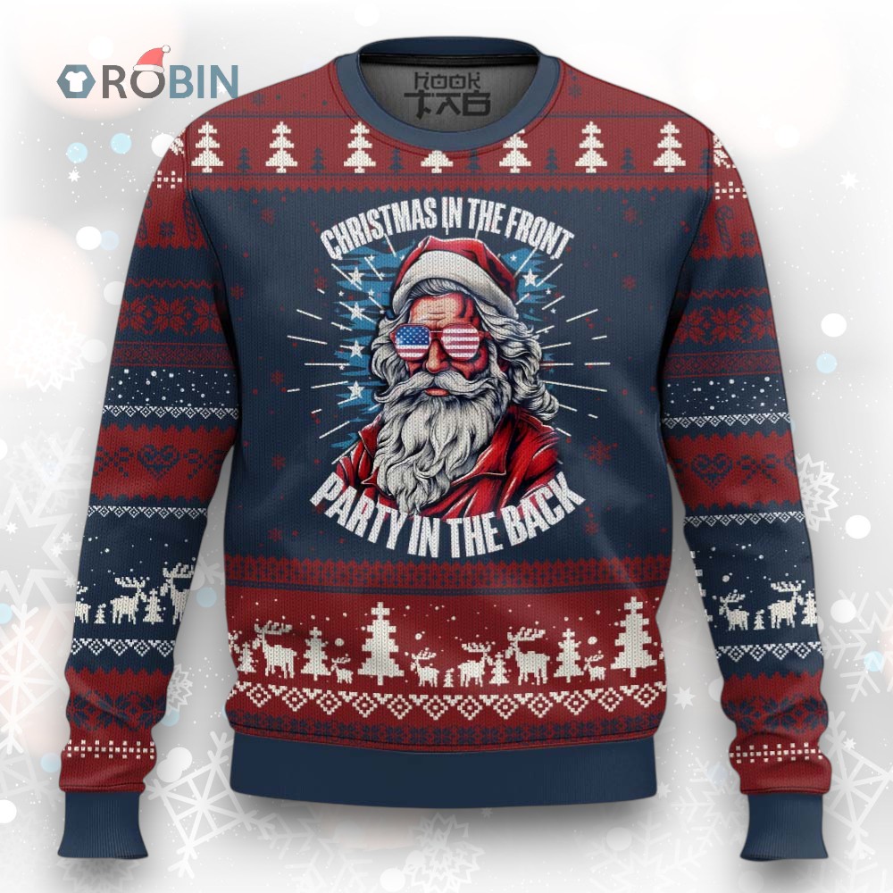 Christmas in the Front Party in the Back USA Patriotic Santa Ugly Christmas Sweater