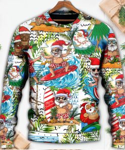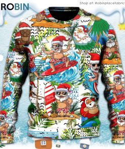 Get your holiday party started in style with the Christmas Santa Aloha Beach Vibe Ugly Sweater Sweatshirt. This festive and fun sweatshirt is perfect for embracing the holiday spirit while also giving off a laid-back beach vibe. With its colorful design featuring Santa Clause, palm trees, and beach umbrellas, this sweater is sure to make a statement at any holiday gathering. Made with comfortable material, you can wear this sweatshirt all night long while still feeling cozy and warm. Spread some holiday cheer and aloha spirit with this unique and festive sweatshirt.