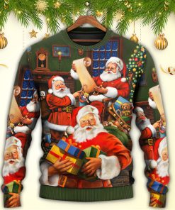 Get into the holiday spirit with this festive and fun sweater! Designed for the Christmas season, this sweater features a playful Santa Claus design. The Santa Claus is depicted with his iconic red suit and white beard, bringing a sense of nostalgia and joy. The art style of this sweater is unique and eye-catching, making it a standout piece for any holiday gathering. The pattern includes a variety of colors and shapes that create a vibrant and cheerful look. Made with a soft and comfortable fabric, this sweater is perfect for keeping warm during the colder months. It is also an excellent gift option for friends and family who love the holiday season. Spread some Christmas cheer and make a statement with this adorable and stylish Santa Claus sweater!