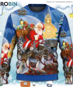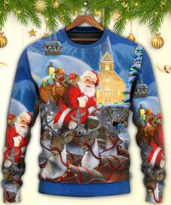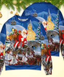 Get ready to spread some holiday cheer with this festive and fun Christmas sweater! Perfect for those who love the holiday season, this sweater features a playful art style that captures the joyful spirit of Christmas. The design showcases Santa Claus and his trusty reindeer, ready to deliver gifts all around the world. Made with a soft and comfortable fabric, this sweatshirt is perfect for cozying up by the fire or attending Christmas parties. With its eye-catching and unique design, this Christmas sweater is sure to be a hit and bring a smile to everyone’s face this holiday season.