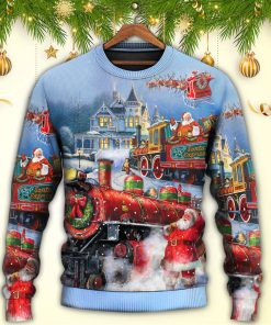 Get ready for the holiday season with this festive and fun ugly Christmas sweater. This unique sweater features a charming painting style design depicting a Santa Claus train full of gifts. The vibrant colors and detailed artwork make this sweater stand out from the crowd. Perfect for any holiday party or gathering, this sweater is sure to bring joy and cheer to your Christmas celebrations. Made with comfortable and high-quality materials, it is not only stylish but also cozy, keeping you warm throughout the winter season. Spread some holiday cheer with this Christmas-themed sweater!