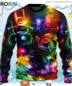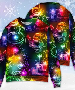 Get into the festive spirit with this one-of-a-kind ugly Christmas sweater! The design features a whimsical neon light style that adds a touch of modernity to the traditional holiday symbols. With Santa Claus, a Christmas tree, and a snowman all illuminated with bright colors, this sweater is sure to catch everyone’s attention. Made with a cozy and comfortable fabric, it’s perfect for cozying up by the fireplace or attending a holiday party. Spread the holiday cheer and stand out from the crowd with this unique and eye-catching Christmas sweater!
