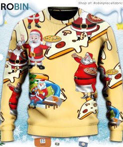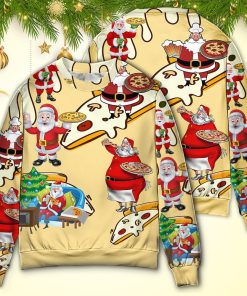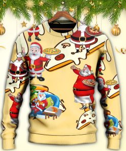 During the festive season, one can spot Santa Claus doing all sorts of unconventional things. One such image that brings a smile to everyone’s face is that of Santa indulging in a slice of pizza. The sight of jolly old Saint Nick enjoying this delicious treat showcases a fun and light-hearted side of Christmas. And what better way to celebrate this amusing scene than by adorning an Ugly Christmas Sweater showcasing this very image? With a picture-perfect combination of red, green, and white, this sweater is sure to spread holiday cheer and become the talk of any Christmas gathering. So, get ready to embrace the joyous spirit of the season with Santa and his favorite pizza!