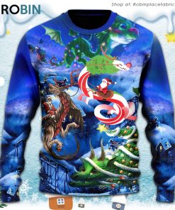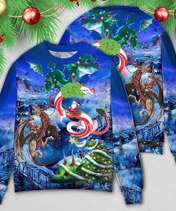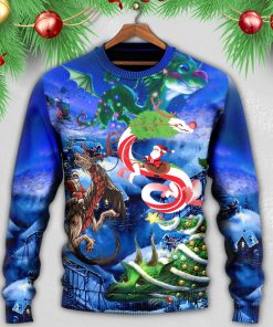 Get in the festive spirit with this unique and eye-catching Christmas sweater. The design features Santa, not in his traditional sleigh, but instead riding a majestic dragon across the night sky. This fun twist on a classic image adds an element of whimsy to any holiday gathering. Made from comfortable and cozy material, this ugly sweater is perfect for lounging by the fire or attending a holiday party. Stand out from the crowd and spread some holiday cheer with this Christmas Santa Riding A Dragon Christmas Ugly Sweater Sweatshirt.