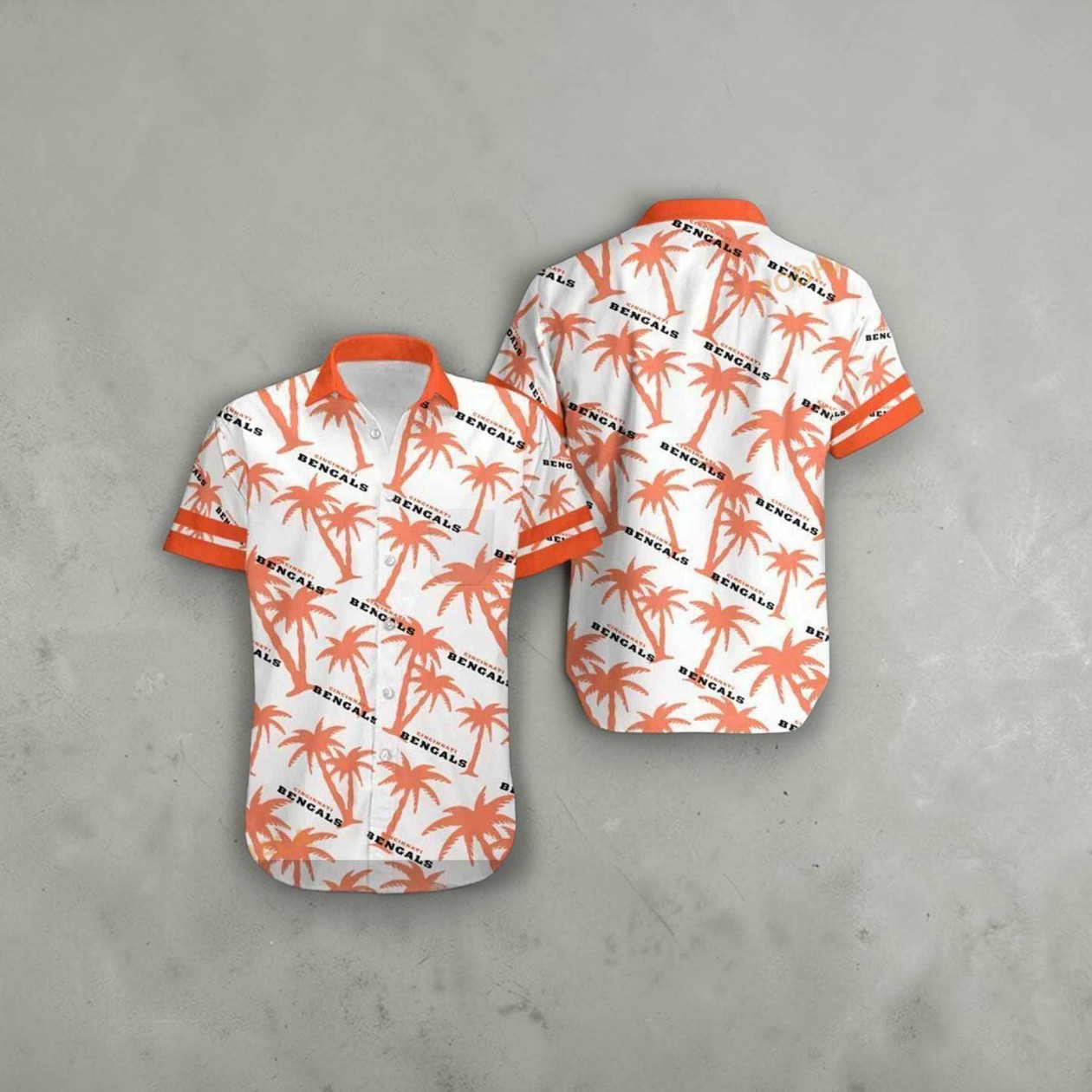 A crisp white shirt layered with a lively splash of orange palm trees sets a lively tone from the very first glance. The vibrant design features bold, all-caps “BENGALS” text woven throughout the pattern, reinforcing a strong sense of team loyalty without overwhelming the tropical vibe. Around the neckline and sleeve cuffs, a solid orange trim adds a sharp, sporty edge that ties the shirt’s playful energy back to the Cincinnati Bengals colors. This is the kind of shirt someone might grab when their weekend plans include a backyard barbecue or a casual day out on the boardwalk. It embodies a blend of laid-back summer ease with a clear devotion to Bengals pride, striking a balance between fan gear and warm-weather style. The graphic pattern feels far from generic—it’s a slice of vacation mode meeting game day excitement, perfect for those who like their fandom with a side of sunshine. This shirt naturally suits the Bengals supporter who values comfort and flair in equal measure, who enjoys showing up to the game or a casual meet-up looking confidently put-together but never overdone. It’s also a thoughtful pick for anyone heading to a tropical getaway who likes to keep their team close, even when miles away from the stadium. The Cincinnati Bengals shirt tropical palm motif can quietly shape everyday moments, blending team spirit into a season of effortless summer style.