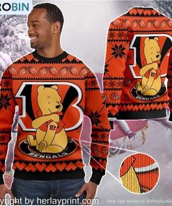 Cincinnati Bengals NFL American Football Team Logo Cute Winnie The Pooh Bear 3D Ugly Christmas Sweater details