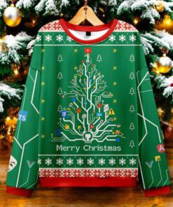 Unleash your inner tech enthusiast this festive season with the sweater that brings a playful twist to traditional holiday wear! This unique piece captures the spirit of Christmas with a geeky charm, featuring intricate details that resemble a festive evergreen adorned in circuit pathways. Perfect for holiday parties or cozy nights by the fireplace, this sweater is a conversation starter that radiates creativity and individuality. Embrace the season with a blend of warmth, whimsy, and a dash of electronic flair!
