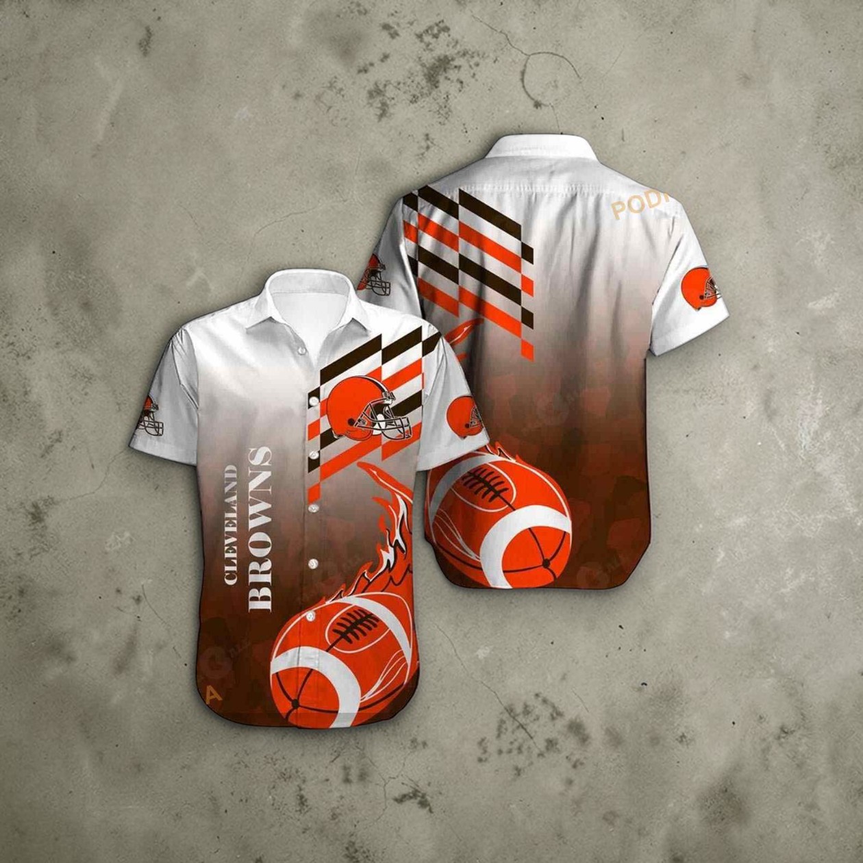 Bold oranges and deep browns clash and blend across this shirt in a way that’s both energetic and distinctly athletic. The gradient background, moving from brown to white, adds a retro-modern flair, while diagonal stripes and repeated football motifs keep the design dynamic and playful. What really anchors the look are the vertically aligned “Cleveland Browns” lettering printed in a strong, sans-serif font—its placement across the front catches the eye without overwhelming. The mix of geometric shapes and iconic helmets feels like a nod to both vintage sports graphics and contemporary streetwear, making it more than just a team shirt—it’s a statement piece for those who wear their fandom with confidence. It’s not for someone who just follows the Browns casually; this shirt speaks to the passionate supporter who enjoys standing out at tailgates or while watching the game with friends. The design fits naturally into everyday moments too. Whether it’s grabbing a coffee after a morning workout or heading to a backyard barbecue, this shirt works well beyond the stadium. Its bold look pairs effortlessly with jeans or shorts, matching that same casual energy Browns fans carry all day long. For anyone invested in the team and wanting something both spirited and wearable, this shirt ticks all the boxes.