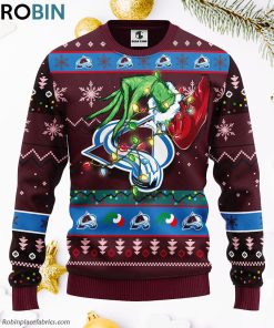 Get into the holiday spirit with this festive Colorado Avalanche Grinch Ugly Christmas Sweater. This sweater features a playful design inspired by the beloved Dr. Seuss character, the Grinch. The Grinch is dressed in a Colorado Avalanche jersey, holding a hockey stick and wearing a mischievous grin on his face. The sweater is made from cozy and comfortable materials, perfect for wearing during the winter months. With its vibrant colors and eye-catching design, this sweater is sure to be a hit at any holiday gathering or Colorado Avalanche game. Show off your love for both the holiday season and your favorite hockey team with this fun and festive sweater.