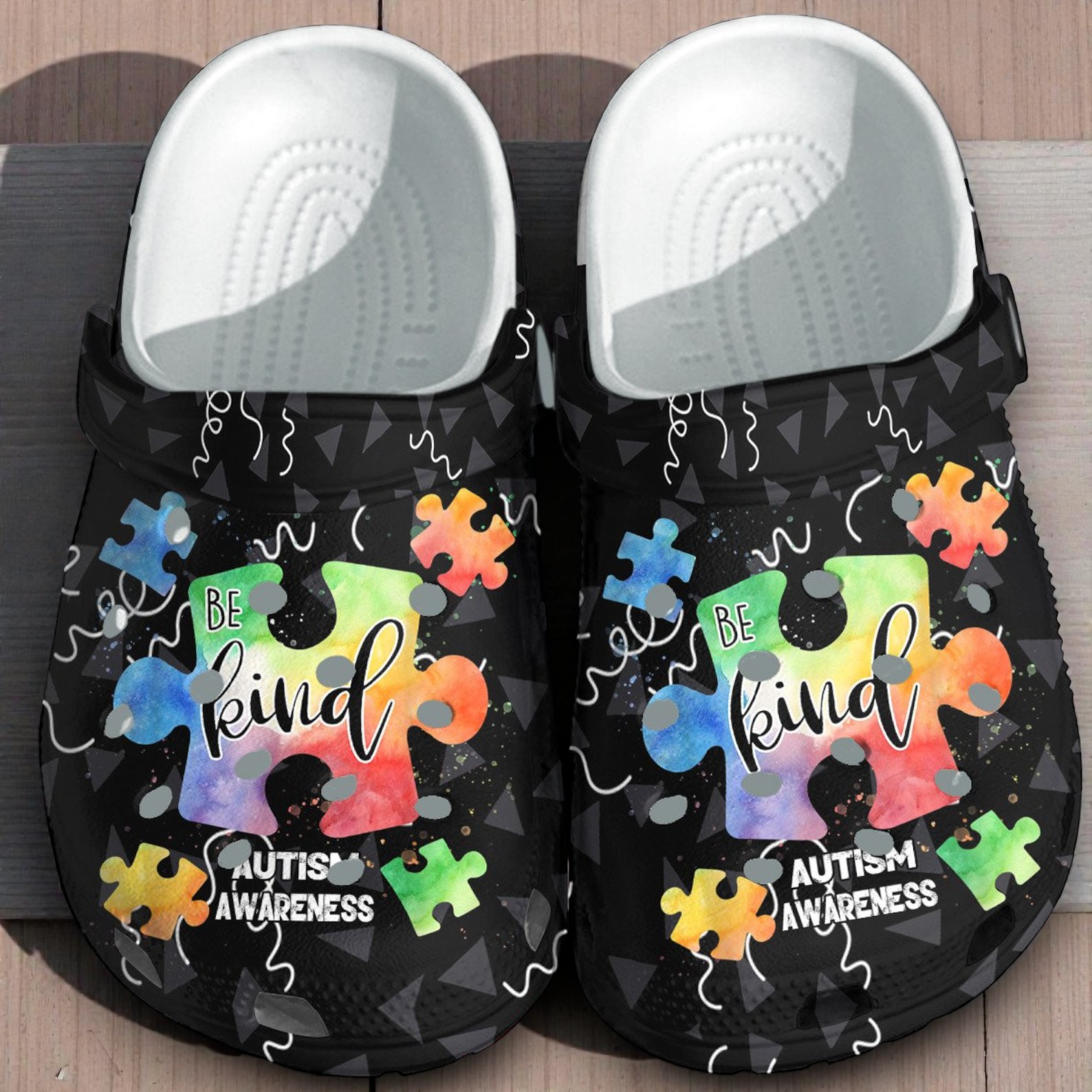 Share a message of support and inclusion with these Autism Awareness Crocs. The design features a bold, rainbow-colored puzzle piece right in the center with the words "Be Kind" written in elegant script.