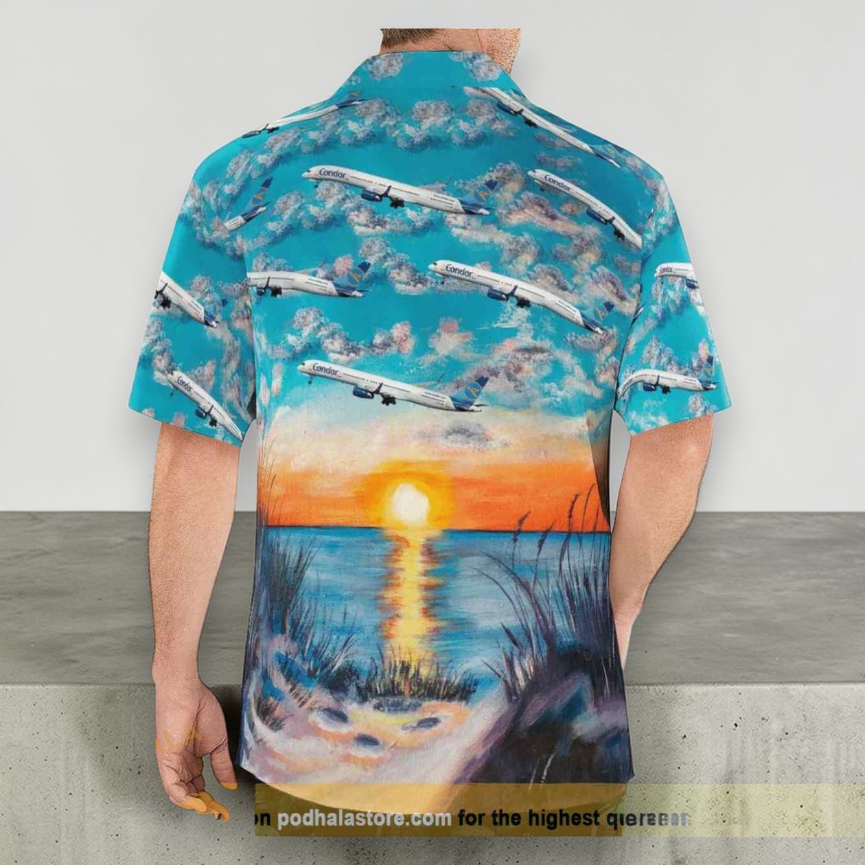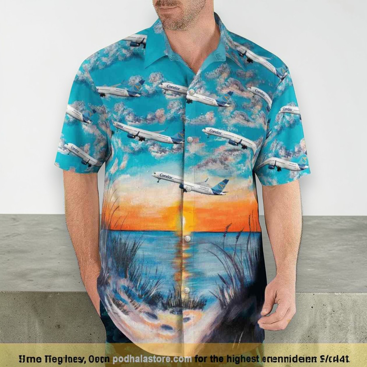 The bright turquoise sky stretching across this shirt commands attention right away, setting a vibrant, tropical stage. Scattered throughout, silhouettes of airplanes follow a gentle landing pattern, perfectly capturing the thrill of travel and the unique rhythm of airports at sunset. Below, the warm hues of an orange and pink sunset melt into calm waters, while soft palm grass sways quietly in the foreground. These layered visuals bring a sense of motion and calm all at once, making the design feel both dynamic and relaxed. This bold take on vacation wear appeals strongly to fans of aviation who appreciate more than just the mechanics of flight—the lifestyle it represents. The design taps into that sense of adventure, the kind that fills frequent travelers and airline enthusiasts with a spark of freedom every time they see a plane crossing the horizon. It’s a nod to identity for those who live with one foot in the clouds and the other on sandy shores. The Condor airplane shirt strikes a balance between retro charm and modern vibrancy, making it great for casual outings or resort wear when comfort meets a distinctive nod to one’s passions. Whether gifted to an aviation lover or worn on a laid-back trip, its lively yet effortless style feels like a quiet celebration of travel’s endless possibilities.