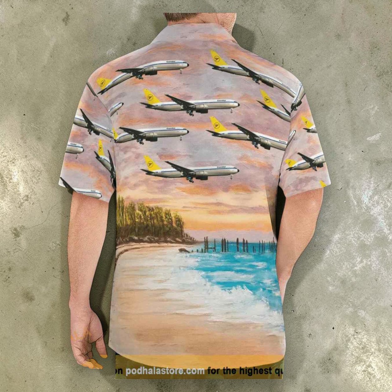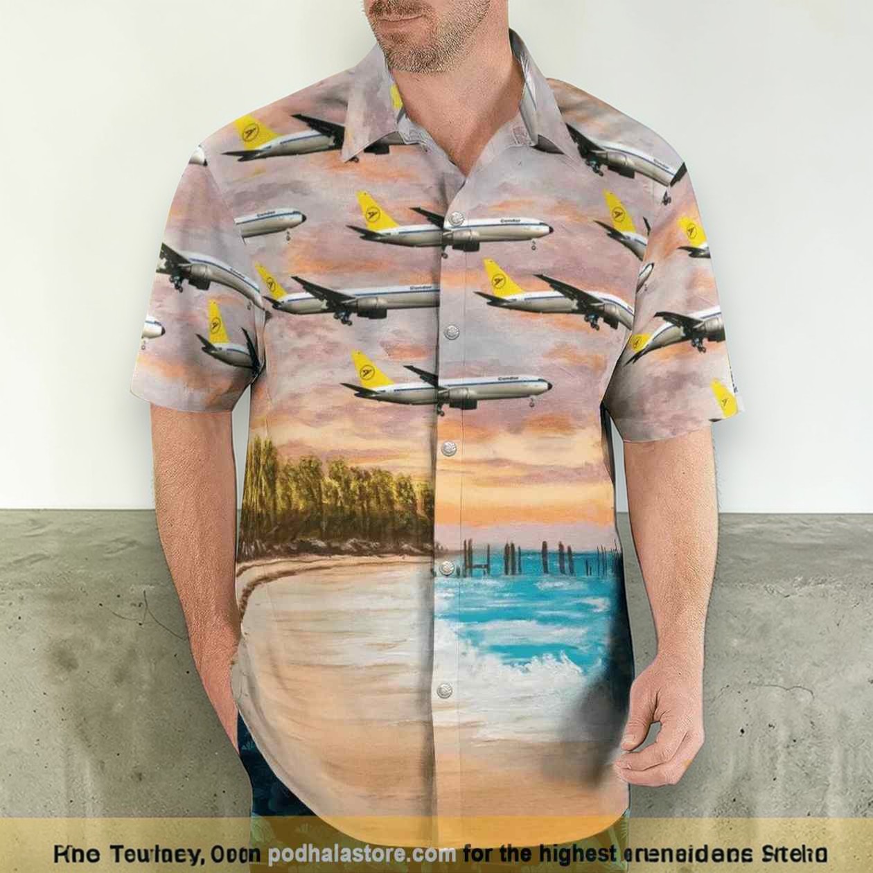 There’s a quiet confidence in wearing something that signals not just style but a particular way of seeing the world. This airplane Hawaiian shirt channels that spirit—melding the thrill of cruising above clouds with the laid-back ease of a tropical sunset. The print is a photorealistic homage to aviation nostalgia: slender jets with bright yellow tails glide over a fading pastel sky, which melts softly into the calm blues of water and the warm hues of a beach dotted with swaying palms and weathered fence posts. It’s the kind of shirt that resonates with those who live for horizon chasing, whether that means actual travel or just the daydream of it. The bold retro vacation vibe captures a moment in time when jet-setting was novel and adventurous, making it more than just an article of clothing. It’s a tiny declaration of belonging—to a tribe of aviation fans and travel enthusiasts who appreciate the poetic romance of flight as much as the hum of engines. Appreciators of this airplane Hawaiian shirt are likely to be the ones who carry stories in their pockets—memories of destinations past or plans still unfolding. It’s a natural fit for casual days that crave something spirited, or for theme parties where passion and personality mingle freely. As a gift, it carries an extra layer of meaning, speaking directly to those who find joy in planes, skies, and the endless allure of exploration.