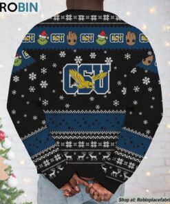 Celebrate the holiday season with a delightful twist on classic festivities by donning this uniquely charming sweatshirt, where the mischievous Grinch and the adorable Baby Groot form an unlikely duo of festive cheer. Perfectly blending beloved pop culture icons with a hint of sports pride, this creative holiday apparel is sure to make a statement at any gathering. Its quirky design and cozy fit are bound to spread smiles and warmth, making it a must-have for those who love to showcase their playful side and team spirit in one merry package. Whether you're attending an ugly sweater party or simply reveling in the holiday mood, this sweater promises to be a conversation starter and a delightful addition to your festive wardrobe.