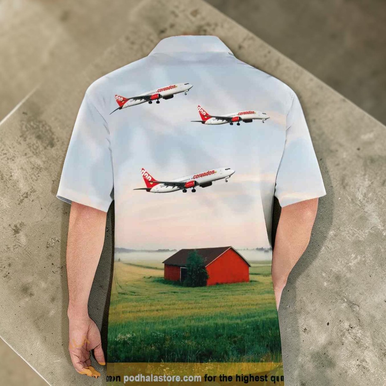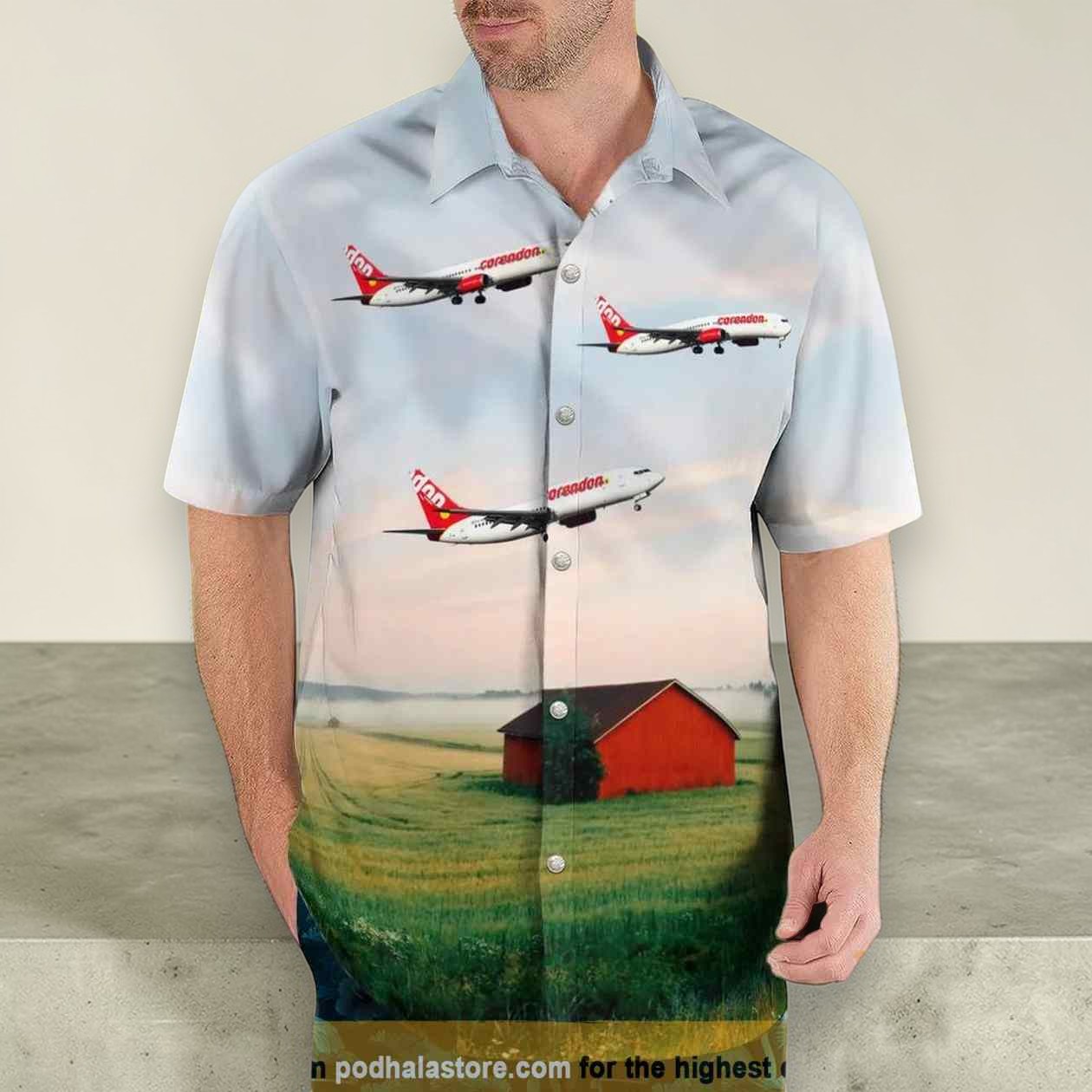 A soothing pastel sky stretches across the fabric, softening the bold lines of the Corendon aircraft gliding just above a bucolic scene. The shirt’s canvas captures a distinctive moment—a cluster of red-branded airplanes cruising above a quiet rural landscape marked by a solitary red barn. Each plane is rendered with careful attention, the subtle wing details and sleek contours evoking the thrill of flight and the precision of aviation craftsmanship. The design balances playful adventure with a retro vibe, making it a fitting wardrobe choice for those whose spirits are lifted by travel and the hum of engines. Aviation enthusiasts will appreciate the nod to Corendon Dutch Airlines, while the imagery invites casual wearers to embrace their wanderlust without the need for tickets or itineraries. It’s a visual story of journeys, both in the sky and in imagination. The shirt’s layout is deliberately expansive, letting the eye wander from the soaring aircraft to the grounded, peaceful farm below—a reminder of the connection between flight and the landscapes that frame it. This garment resonates with a personality that values boldness in taste but cherishes subtlety in narrative. Worn on relaxed outings or themed gatherings, the Corendon airlines shirt moves beyond mere clothing to become an expression of identity and interest. As a gift, it quietly honors those fascinated by the rhythm of travel, the nuances of aviation, or simply a laid-back, adventurous spirit eager to wear its passions lightly and well.