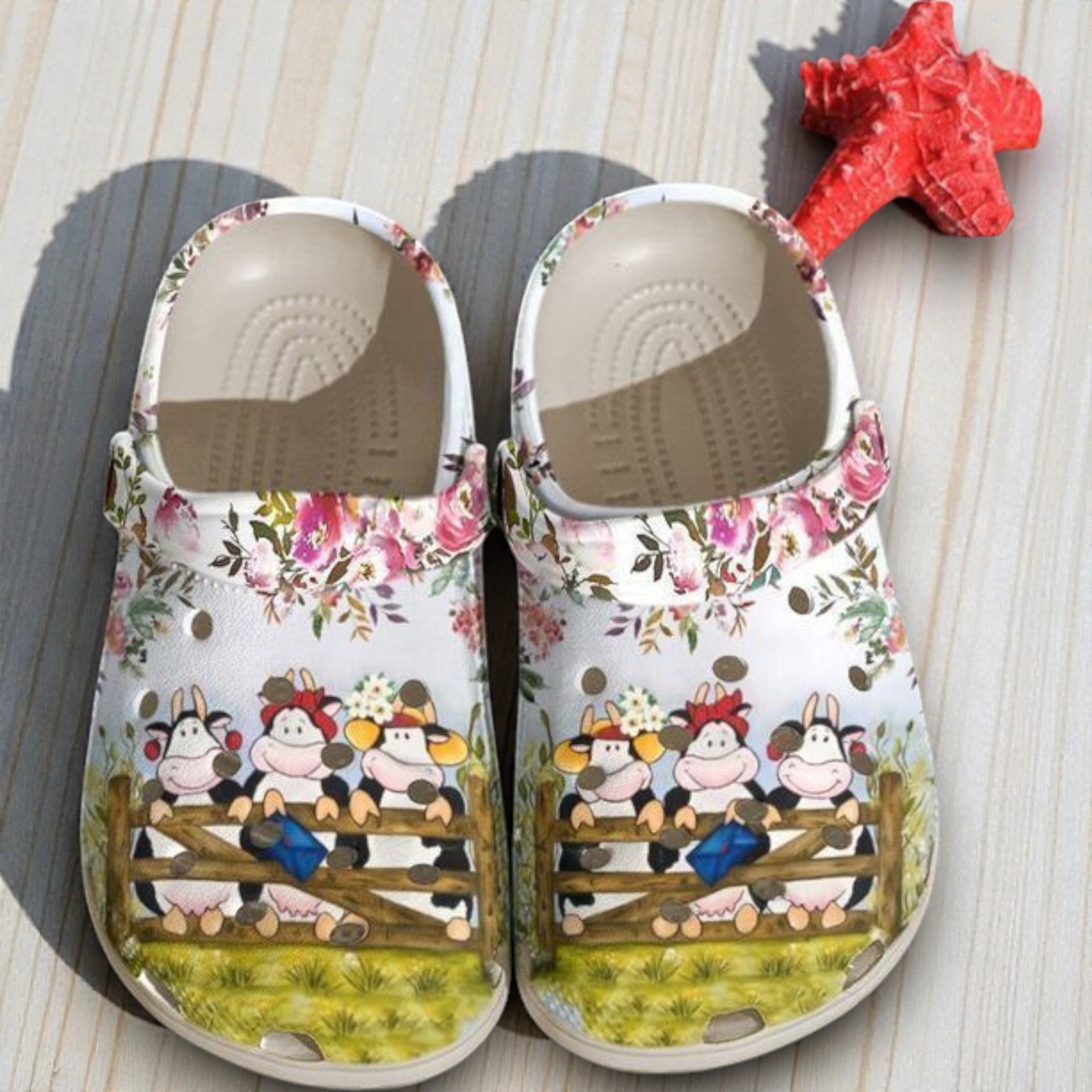 These custom Crocs bring a scene of friendship and farm life right to your feet. The design features a delightful illustration of three black-and-white cows leaning casually over a wooden pasture fence, looking like best friends catching up on the latest news. Each cow has its own personality: one sports red earrings, the middle one wears a red bow and holds a blue love letter, and the third rocks a yellow sun hat with flowers.