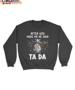 The design of the Cow After God Made Me He Said Ta Da Shirt features a cute and playful image that captures the whimsical spirit of the saying. The shirt depicts a clever interpretation of the creation process with a humorous twist. The vibrant colors and high-quality print make it a fun and eye-catching piece to wear. Perfect for those who appreciate light-hearted and witty fashion choices, this shirt is sure to bring a smile to anyone’s face. Made with care and attention to detail, it is a unique and charming addition to any wardrobe.
