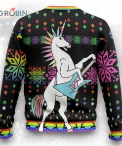Looking for a holiday sweater that rocks? This design features a vibrant unicorn shredding on a guitar, complete with a rainbow mane and colorful snowflakes. Perfect for adding a touch of humor to your Christmas gatherings. Want to stand out with festive flair? Let this playful unicorn lead the way in your holiday celebrations!
