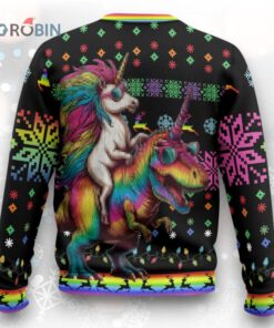 Transform holiday gatherings with a splash of whimsy! This vibrant design features a unicorn riding a T-Rex, both flaunting shades and rainbow hues against a backdrop of colorful snowflakes. Perfect for grabbing attention and spreading laughter, it’s the ultimate festive statement for those who love to stand out. Personalize it with your name to make this quirky creation uniquely yours.