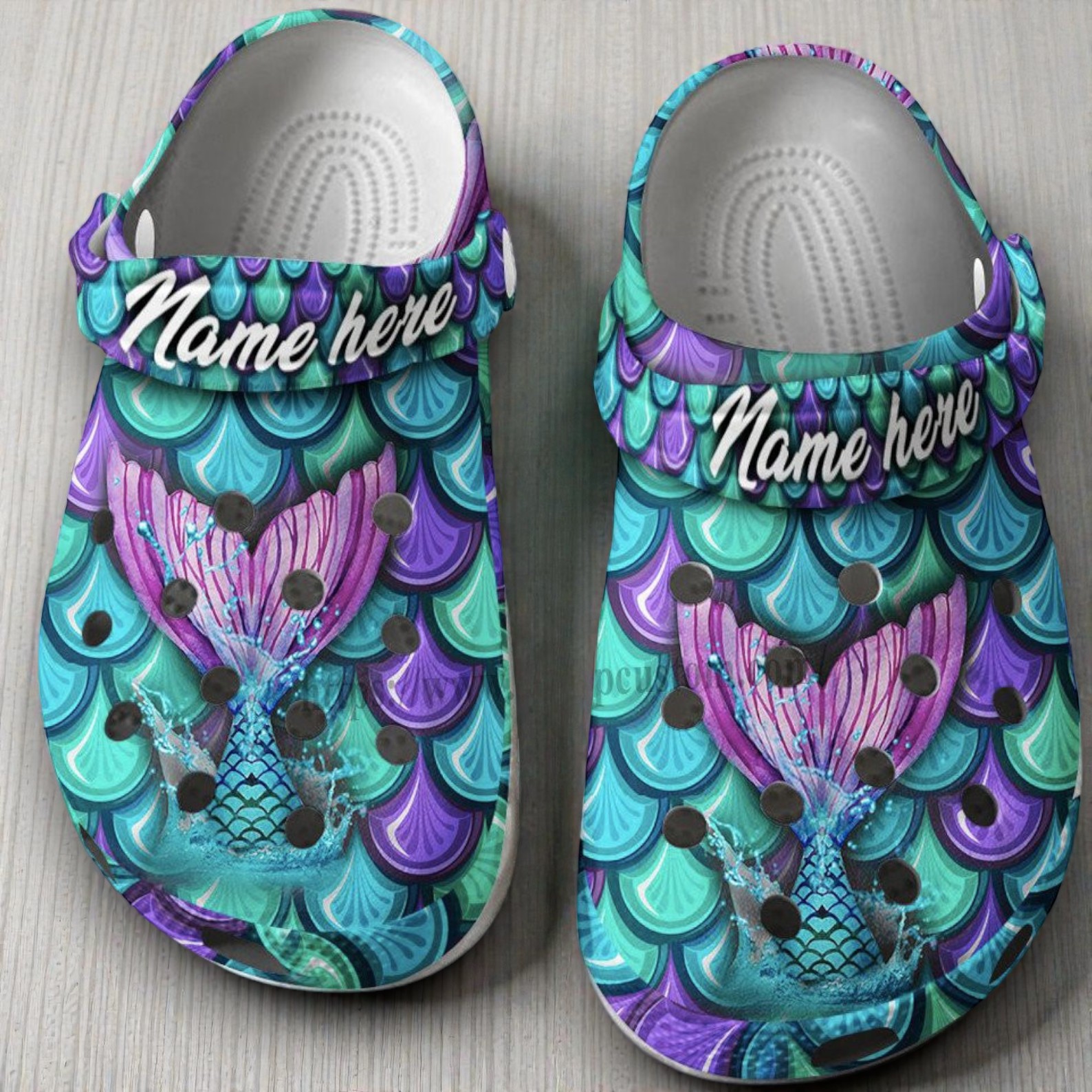 If you or someone you know loves mermaid aesthetics, these custom Crocs are going to be an instant favorite. The design completely covers the shoe in vibrant teal, blue, and purple ocean scales, featuring a beautifully detailed mermaid tail splashing into the water right on the top. To make them completely unique, we print your own name—or any text you want—directly across the strap.