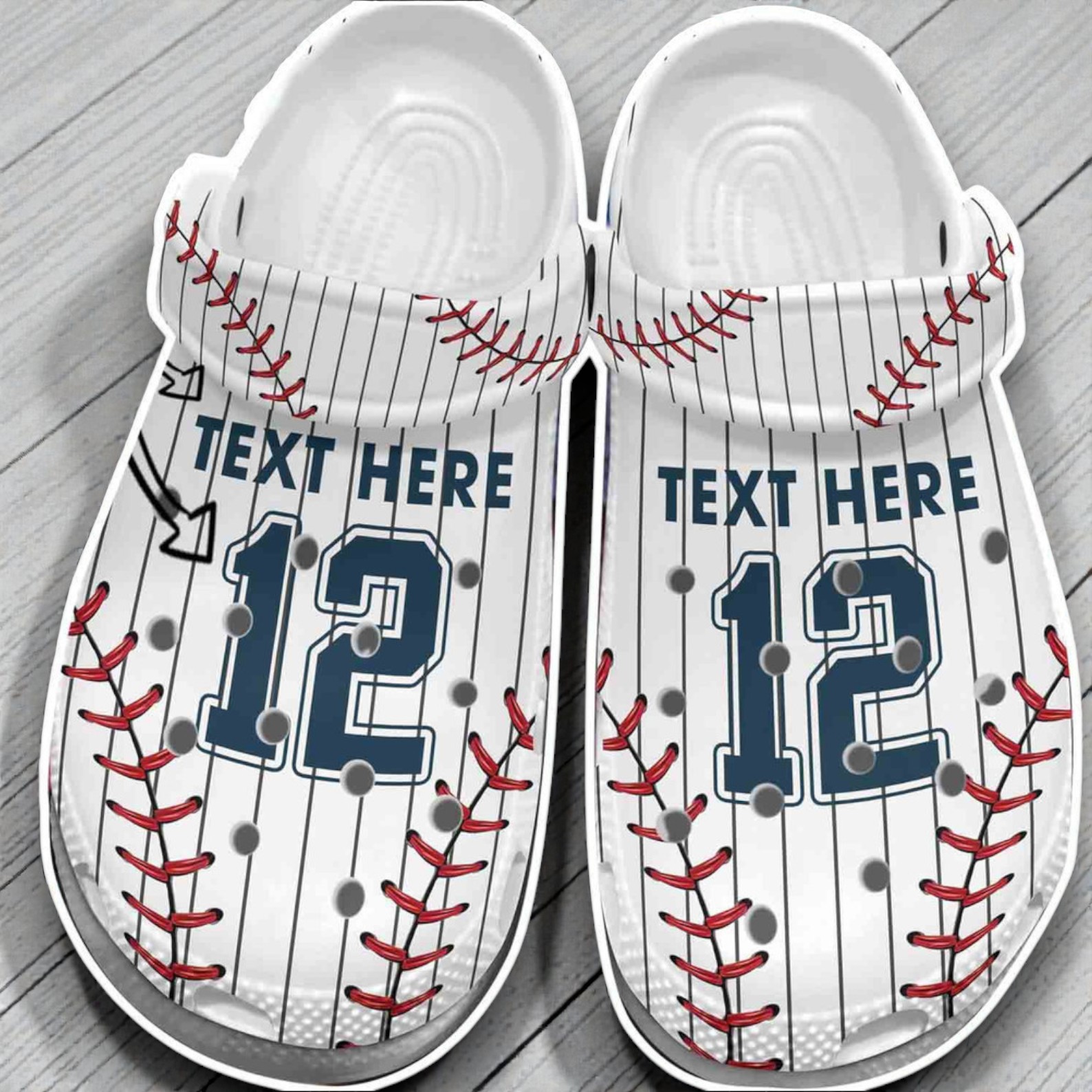 Step up to the plate with these classic baseball-inspired Crocs. Designed to look like a traditional jersey, they feature a crisp white background with black vertical pinstripes and realistic red baseball stitching along the sides and strap.