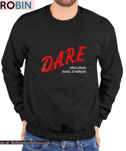 The Dare Drug Abuse Raves Ethereum Shirt is a unique and eye-catching shirt that combines elements of drug awareness, dance music culture, and cryptocurrency. The design of the shirt is bold and colorful, featuring a mix of symbols associated with these different themes. The shirt serves as a conversation starter and may spark discussions about the dangers of substance abuse, the excitement of raves, and the innovative technology of Ethereum. It is a statement piece that appeals to individuals interested in these diverse interests and may be worn to events or parties where these topics are relevant.