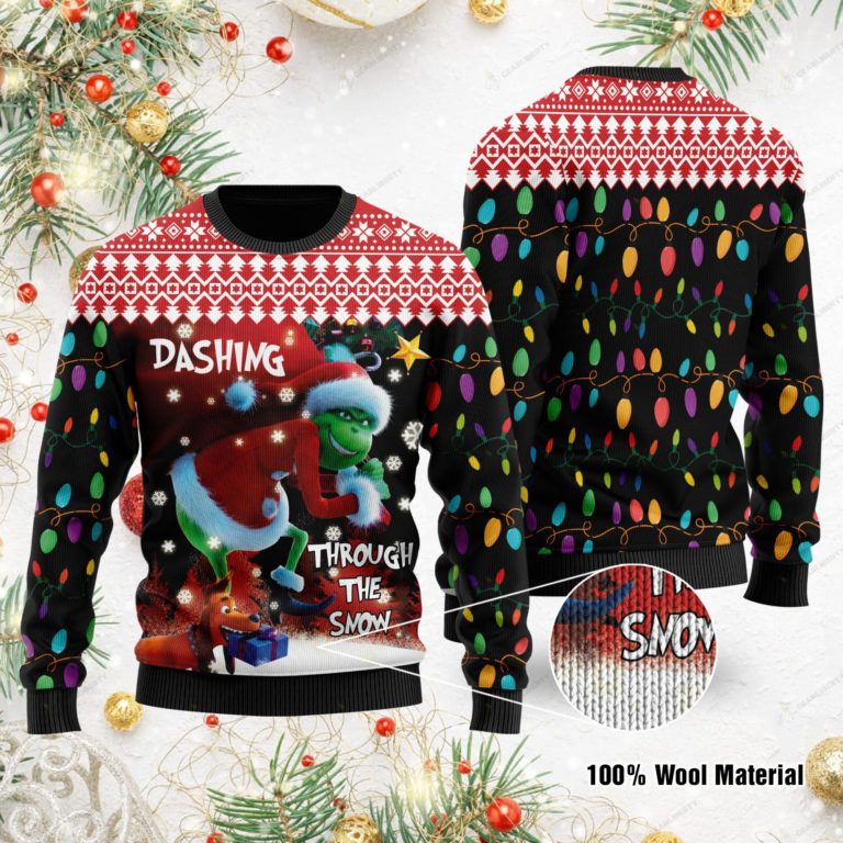 This Dashing Through The Snow The Grinch Ugly Sweater For Some One Who Loves The Grinch available in adult and youth size.