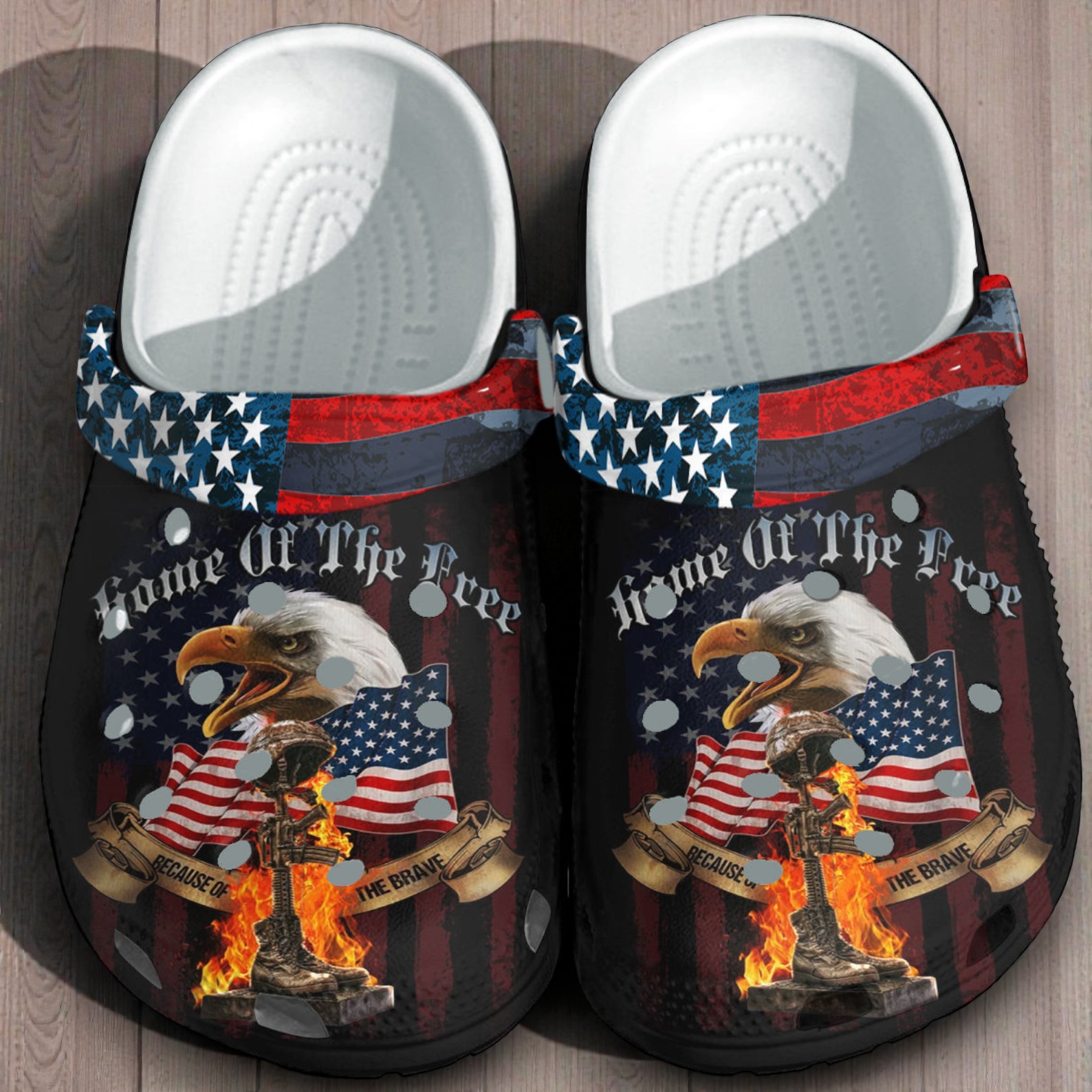 These Military Tribute Crocs serve as a wearable salute to the men and women who serve. Featuring a powerful "Home of the Free, Because of the Brave" motif, the design centers on a Bald Eagle—the ultimate symbol of American strength—alongside a Battlefield Cross, honoring those who have made the ultimate sacrifice.