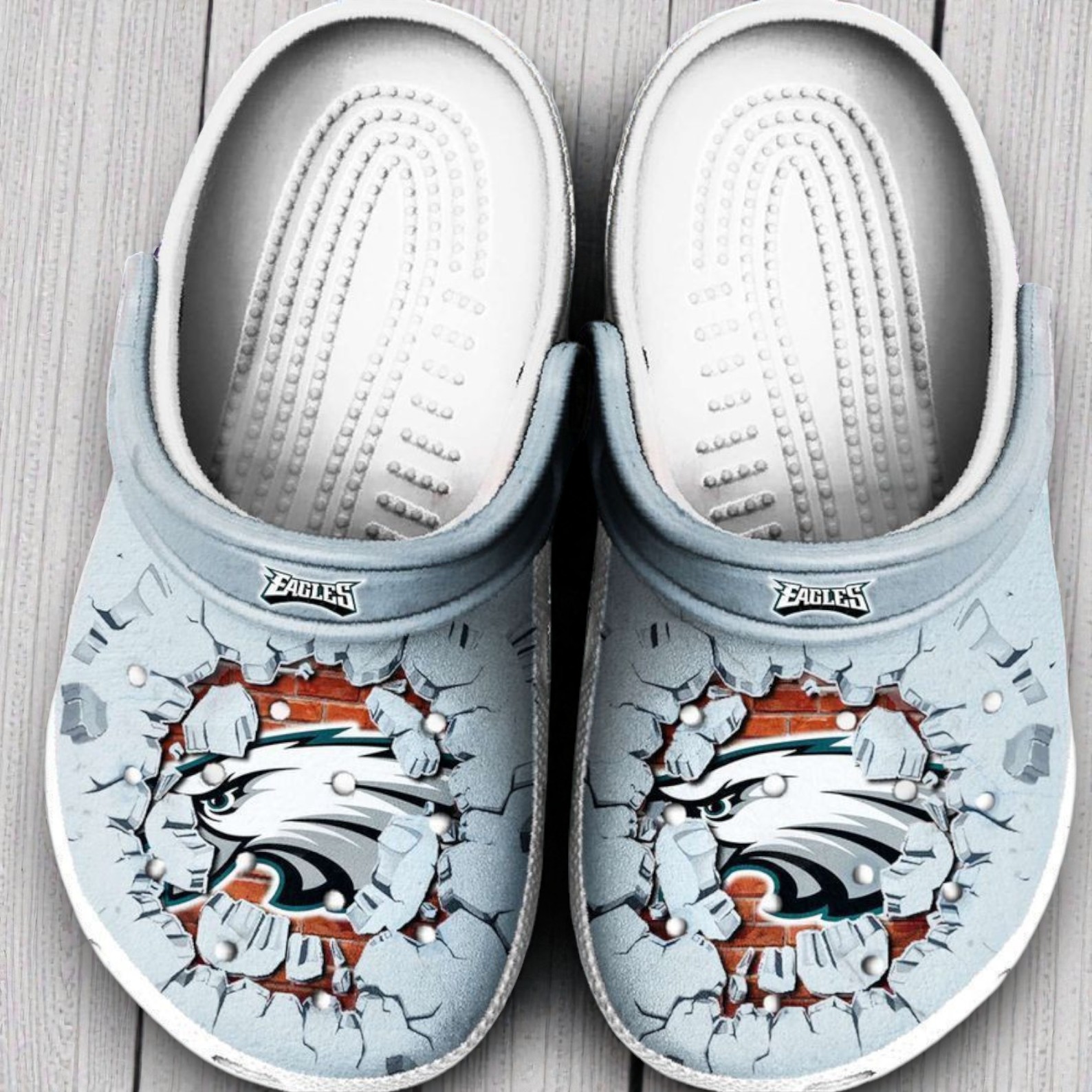 The sharp contrast of a cracked brick wall splintering beneath the bold sweep of an Eagles logo immediately commands attention. Cool light blue stretches across the base of the shoe, a subtle canvas that lets the white sole and textured studs pop with crisp clarity. The fractured pattern beneath the emblem suggests raw energy, a grit beneath sleek athleticism. Custom names curve along the side in a clean, confident script—personalizing the motion, marking ownership like a badge of loyalty. This design isn’t just about team pride but about an attitude: dynamic and aggressive, relentless and unyielding. It feels like the echo of a crowd’s cheer resonating in the clogs’ every step, a literal foundation for walking through game day or casual weekends with the same spirit that fuels the players on the field. Fans who see their passion as part of their identity will find something meaningful in the combination of toughness and style here. Beyond the stadium, these shoes slip easily into everyday life, grounding moments of relaxation with unmistakable character. They make a thoughtful gift for anyone who thrives on that electric connection between sport and self, fan and team. Few pieces of casual footwear balance boldness and comfort with such careful craftsmanship—bringing a sense of purpose to every stride in these Eagles Tide Clog Shoes Custom Name.