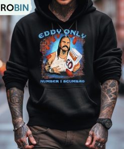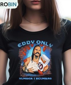 The Eddy Only Number 1 Scumbag T Shirt is a bold and edgy piece of clothing that exudes a rebellious attitude. With its black fabric and striking white font, this t-shirt is sure to make a statement. The words Number 1 Scumbag boldly printed on the front showcase a sense of confidence and nonconformity. This shirt is perfect for those who want to break away from the norm and embrace their own unique style. Made with high-quality materials, this t-shirt is comfortable and durable, making it a must-have for any fashion-forward individual.