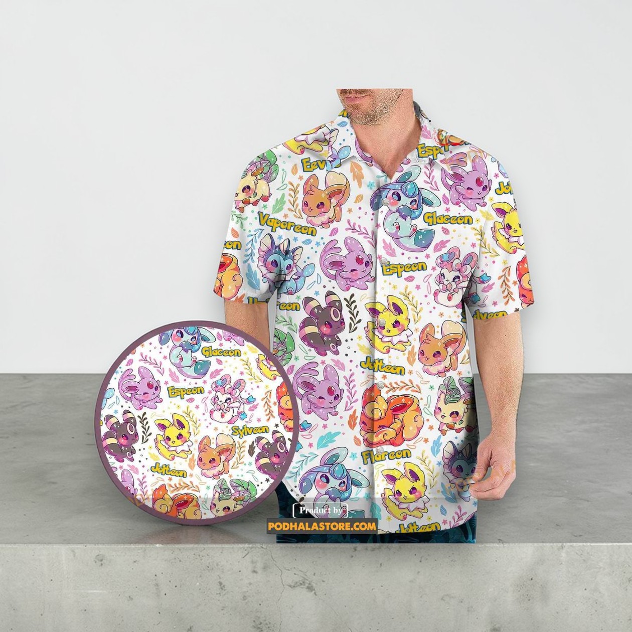 There’s something instantly charming about this shirt the moment you notice its lively print: the classic Eevee and its evolutions—Vaporeon, Jolteon, Flareon, and the rest—are scattered playfully across a backdrop of bright tropical leaves and hibiscus flowers. The combination feels both cheerful and relaxed, capturing that carefree summer energy without trying too hard. It’s the kind of pattern that invites you to lean in and appreciate the little details, like the way each character’s expression is just a touch mischievous. This is no subtle nod to Pokémon fandom. The graphics are bold enough to catch the eye but balanced by soft pastels and sunny yellows that keep it feeling light rather than loud. It’s a funny Hawaiian shirt that doesn’t take itself seriously, yet it manages to look stylish in a laid-back way. The silhouettes of these beloved creatures weaving through the leaves give off a definite vacation vibe—not something you’d reserve solely for game nights, but one you'd wear to a BBQ, a casual day at the beach, or just because it makes you smile. Pair it effortlessly with your favorite shorts, or throw it over a tank top with well-worn jeans. This shirt is for those who aren’t afraid to show a bit of playful personality, whether you’re a longtime Pokémon fan or someone who just appreciates clever design. It also makes a thoughtful gift for friends who enjoy nostalgic, upbeat pieces that double as conversation starters. This Eevee evolution cute pattern enjoy this summer funny Hawaiian shirt, Pokemon gear feels like sunshine you can wear, ready to brighten any warm day.