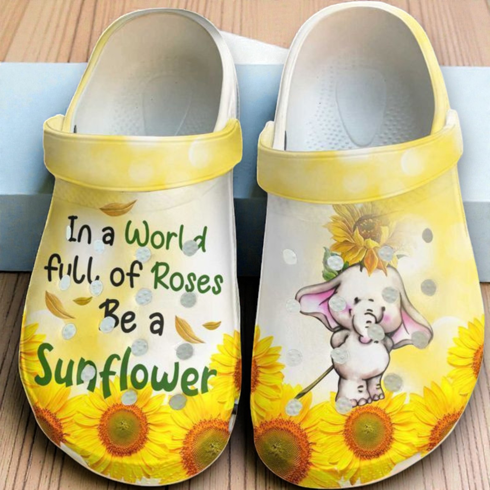 There’s something infectious about a design that radiates joy without trying too hard. These Sunflower Crocs capture that effortless spirit with their bright yellow base, dotted accents, and a whimsical elephant character that seems to smile back at you. The handwritten text that weaves through the sunflower imagery feels like a little nudge toward optimism—a reminder that a sunny outlook is always within reach. At first glance, the playful mix of typography and natural motifs invites curiosity, while the cheerful pattern makes it clear these aren’t just shoes; they're a mood. The boldness of the colors and the charm of the elephant create a vibe that’s perfect for anyone who embraces a lighthearted, positive approach to life. These Crocs don’t merely accessorize an outfit—they become an expression of a personality that’s both fun-loving and open-hearted. They pair effortlessly with casual, everyday gear: think denim shorts and a breezy tee or a soft sundress, both complementing the carefree energy of the design. Kids who delight in nature and adults who appreciate a touch of whimsy would both find something to love here. These shoes feel right at home between backyard adventures and easy strolls through the neighborhood, always a conversation starter and a bright spot on even the dullest days. For those who want footwear that reflects a sunny disposition without sacrificing comfort, this style makes a confident statement—joy, playfulness, and a little charm all in one vibrant package.