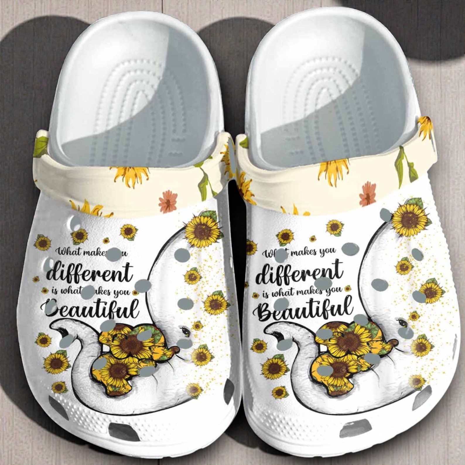 Celebrate your uniqueness with these sweet custom shoes. The design features a gentle white elephant decorated with bright yellow sunflowers, paired with the touching quote: "What makes you different is what makes you beautiful."