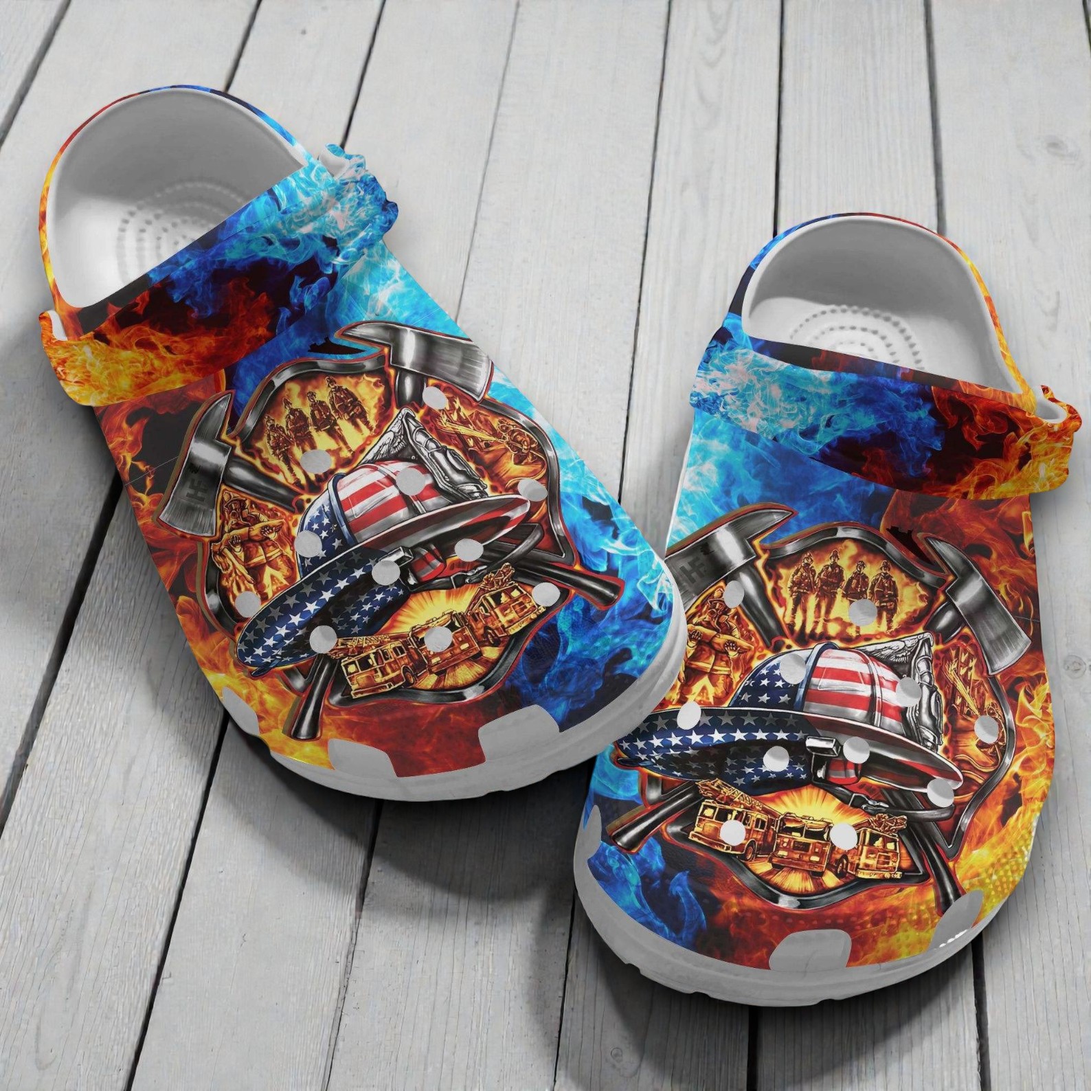 The design is visually striking, split between roaring red fire on one side and cool blue flames on the other. In the center, a highly detailed American flag helmet sits over crossed axes, surrounded by silhouettes of the squad in action and the fire trucks that get you to the scene. It is a powerful, colorful tribute to the job.