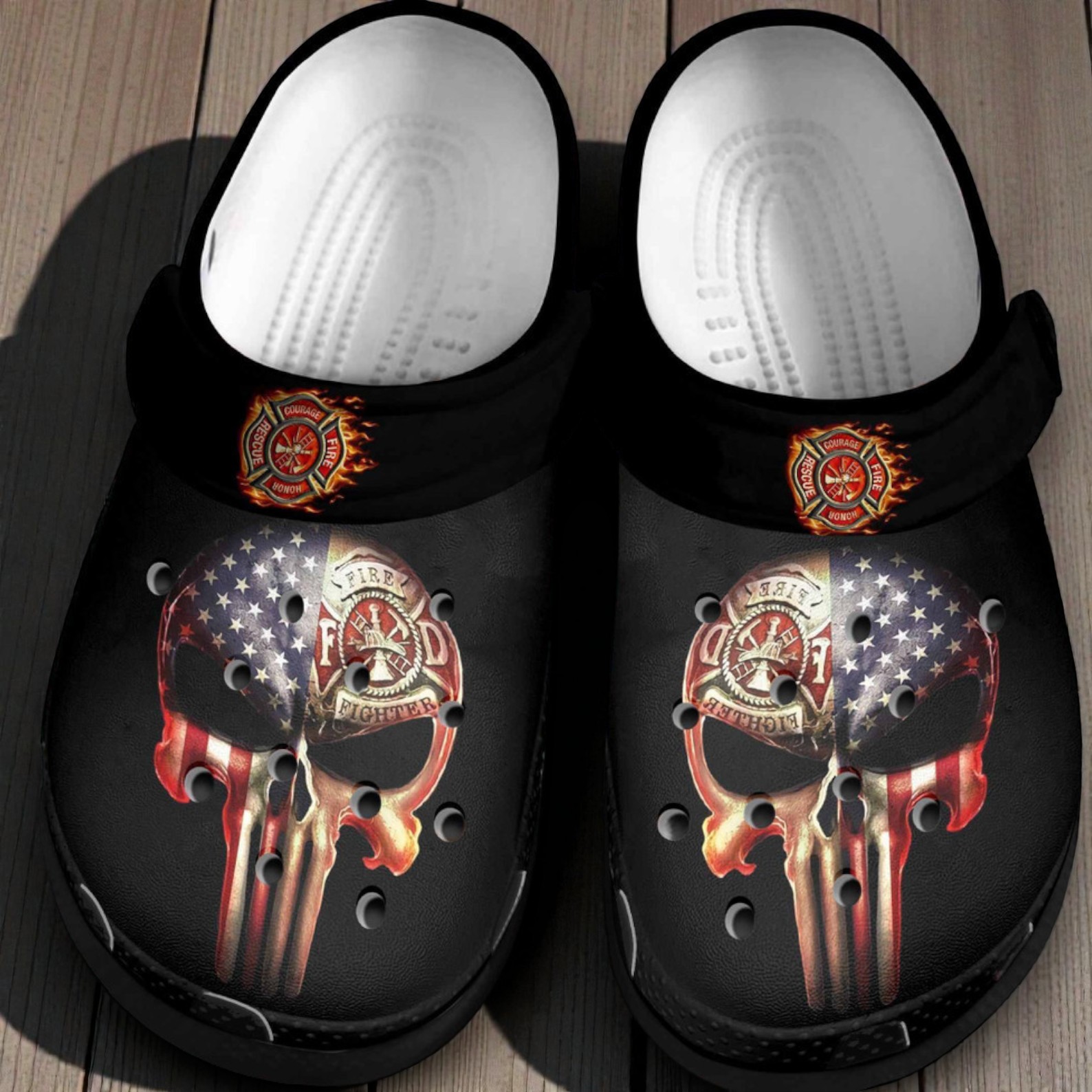 These black Crocs are built for a bold look. They feature a large, gritty skull graphic on the front that combines American pride with the spirit of the fire service.