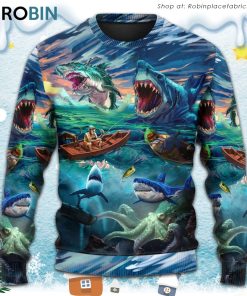 Fishing Shark Crazy Art Style Ugly Christmas Sweater details