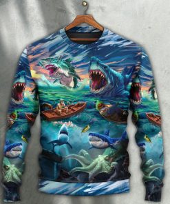 This unique and eye-catching Christmas sweater is perfect for those who want to stand out during the holiday season. The design features a playful and creative art style, with a fishing shark as the main focal point. The colors are vibrant and the details are intricate, making it a true work of art. Despite its unconventional look, the sweater still embodies the festive spirit with subtle Christmas elements incorporated into the design. Wear this sweater and let your personality shine while spreading holiday cheer.
