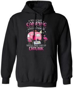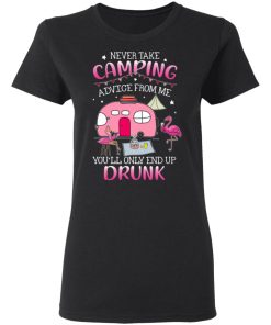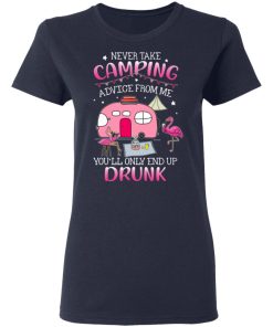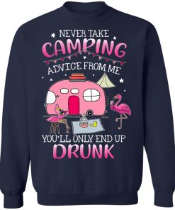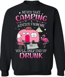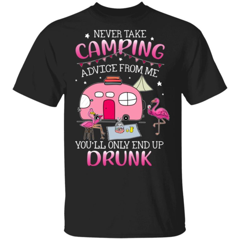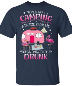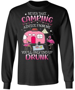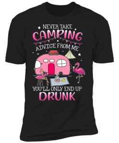 Flamingo never take camping advice from me youll only end up drunk shirt. Available in t shirt, long sleeve, tank top, hoodie, sweatshirt and multiple color. If you want in another color please contact us.