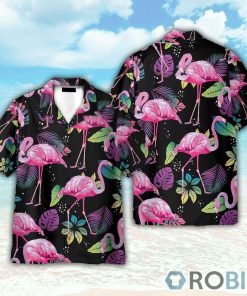 Flamingo Tropical Leaf Summer Hawaiian Shirt features
