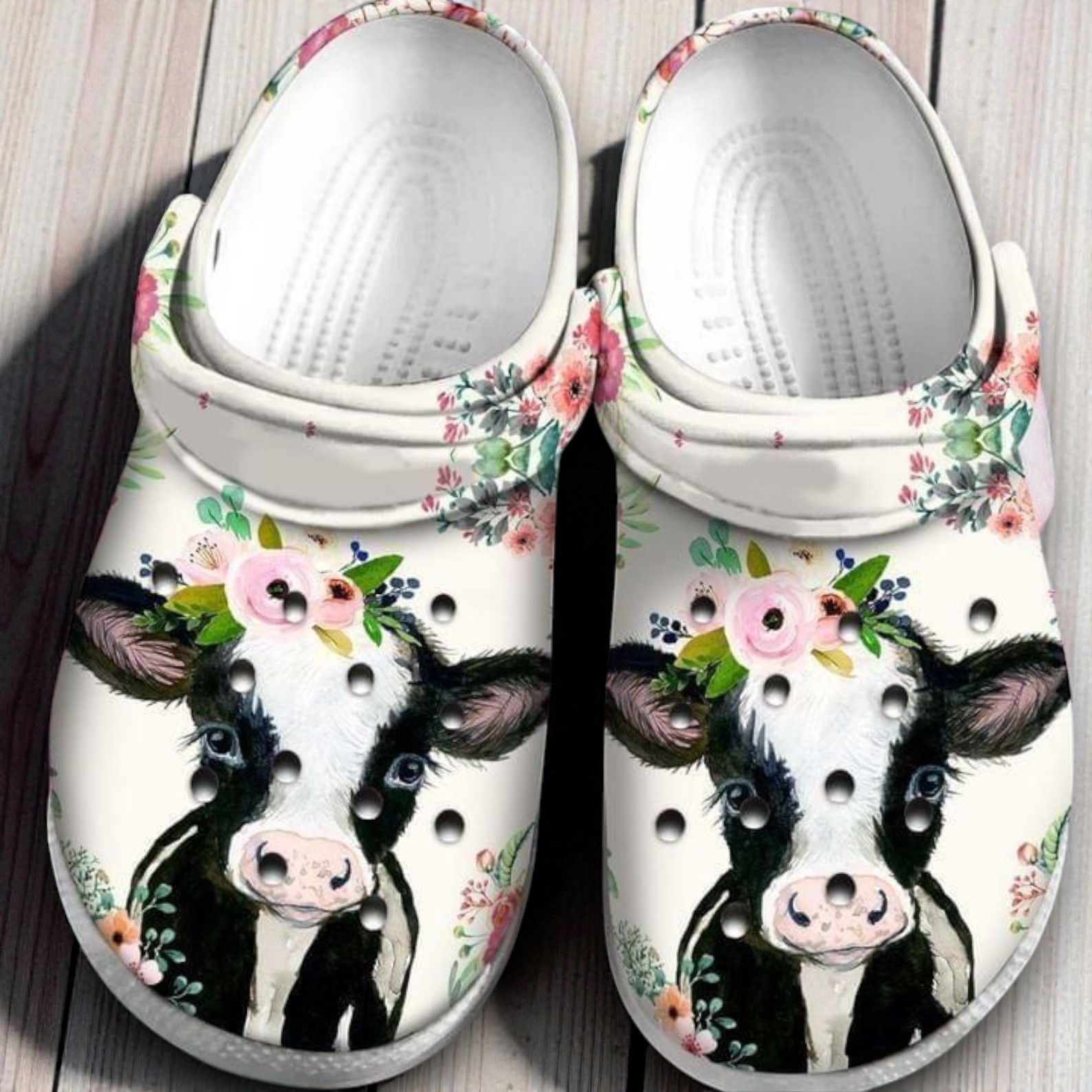 If you love the whole country farmhouse vibe or just have a soft spot for cows, these are going to be your new favorite everyday shoes. We designed these white Crocs with a sweet, watercolor-style black and white cow wearing a little pink flower crown. The soft pink florals and green leaves wrap around the edges, giving it a really pretty, cottagecore feel.