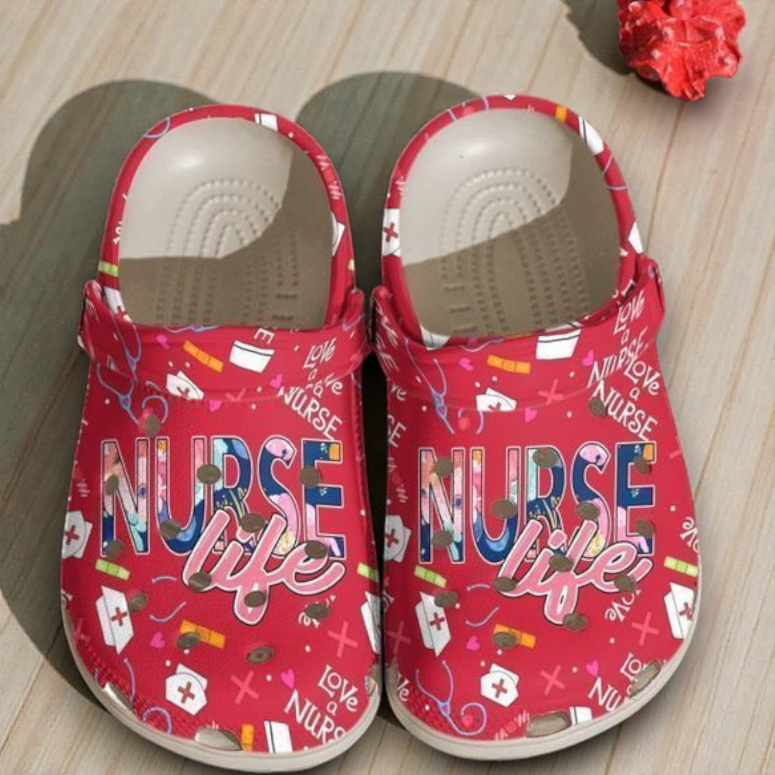 Add some energy to your work uniform with these vibrant red Nurse Life Crocs. The design is full of personality, featuring a fun background pattern of nursing hats, stethoscopes, band-aids, and "Love a Nurse" text. The center highlights "NURSE life" with a beautiful floral fill inside the letters.