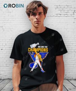 Show your Blues pride with this unique hockey shirt! A rock legend meets a hockey dynasty. Celebrate the St. Louis Blues and the iconic "We Are The Champions" anthem in one awesome design. Perfect for game days or any day you want to show your fandom. Get yours now!