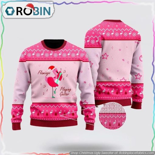 Funny Flamingo Playing Guitar Christmas Christmas Ugly Sweater details