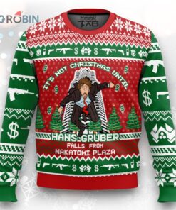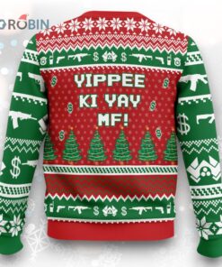 Bring a touch of humor to your holiday festivities with this quirky design featuring a nod to an iconic action film moment. With Yippee Ki Yay and a hilarious scene from Nakatomi Plaza, it's perfect for those who love to mix festive cheer with classic movie references. This eye-catching green sweater adds a playful twist to any Christmas gathering.