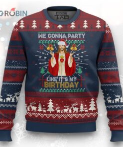 Get into the festive spirit with our “Funny Jesus Birthday Ugly Christmas Sweater.” Featuring a humorous Jesus design declaring, We Gonna Party Like It's My Birthday, this sweater adds a playful twist to your holiday celebrations. Perfect for Christmas gatherings, this print is sure to be a conversation starter and spread joy and laughter all season long!