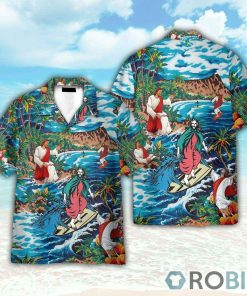 Funny Jesus Surfing On Island Hawaiian Shirt features