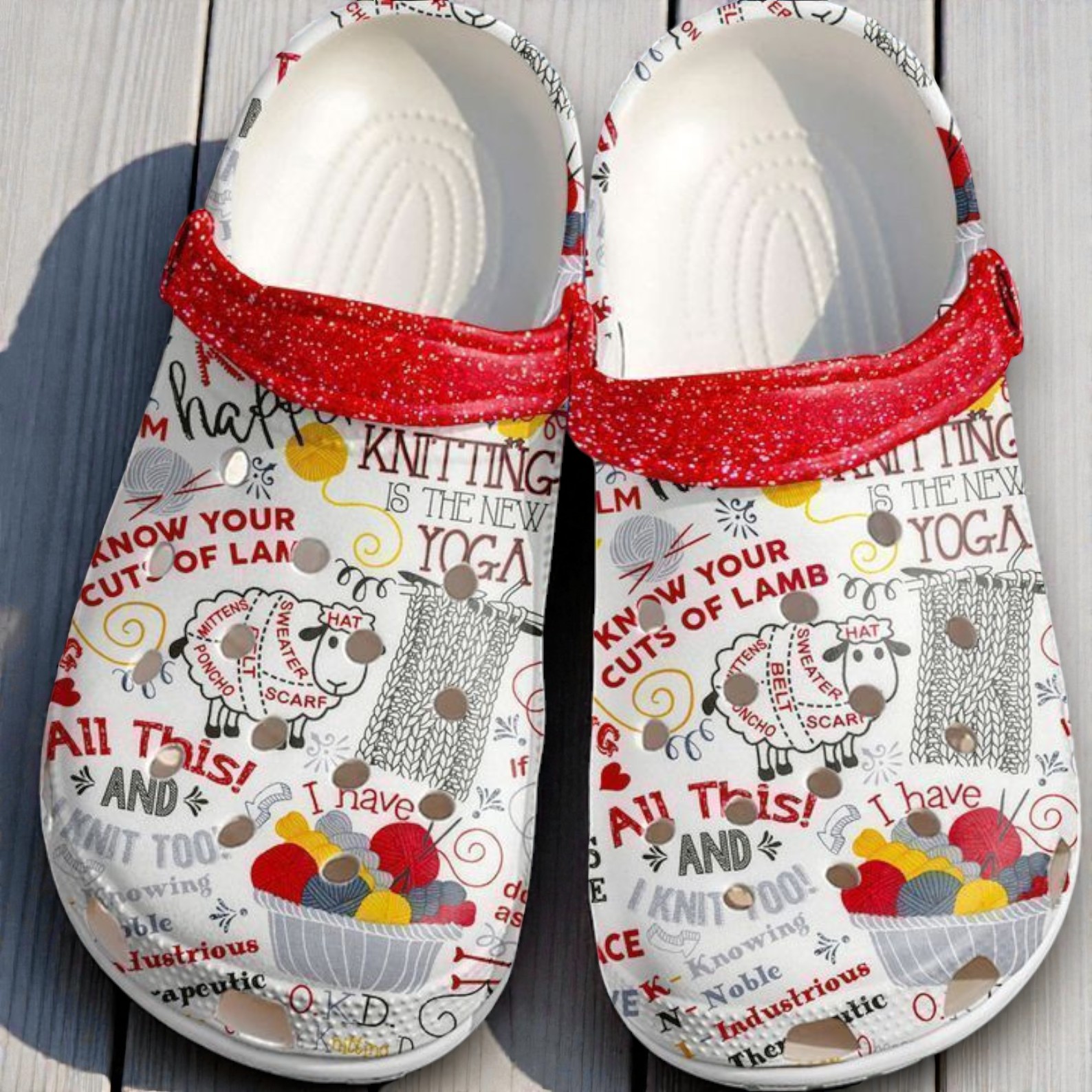 If you spend most of your free time with needles and yarn in hand, you need a pair of shoes that actually match your favorite hobby. These knitting-themed Crocs are packed with relatable, funny details that any dedicated crafter will appreciate. The print features baskets of colorful yarn, a hilarious "Know your cuts of lamb" sheep diagram showing where sweaters and scarves come from, and the ultimate truth: "Knitting is the new Yoga." We finished the design with a sparkly red strap just to give it a fun pop of color.