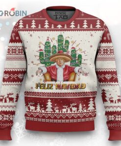 Wondering how to add humor to your holiday wardrobe? This sweater features a playful Santa with a festive twist. Showcasing a unique design with a sombrero-clad Santa surrounded by cacti, it's perfect for spreading laughter and cheer. Feliz Navidad is boldly displayed, making it ideal for those who love a mix of fun and festive flair. Make a statement at your next Christmas gathering!