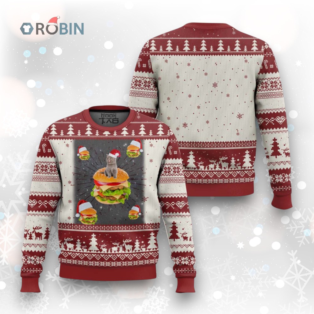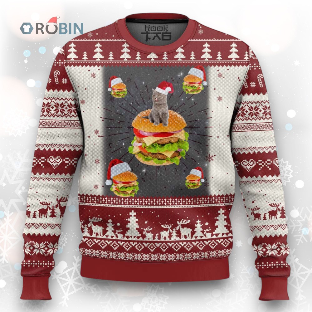 Meowy Christmas, burger lovers! 🍔🚀 This sweater has it all: Santa cats, galaxies, and a serious craving for patties. Get ready to be the purr-fectly ugly Christmas sweater winner! 🎄✨
