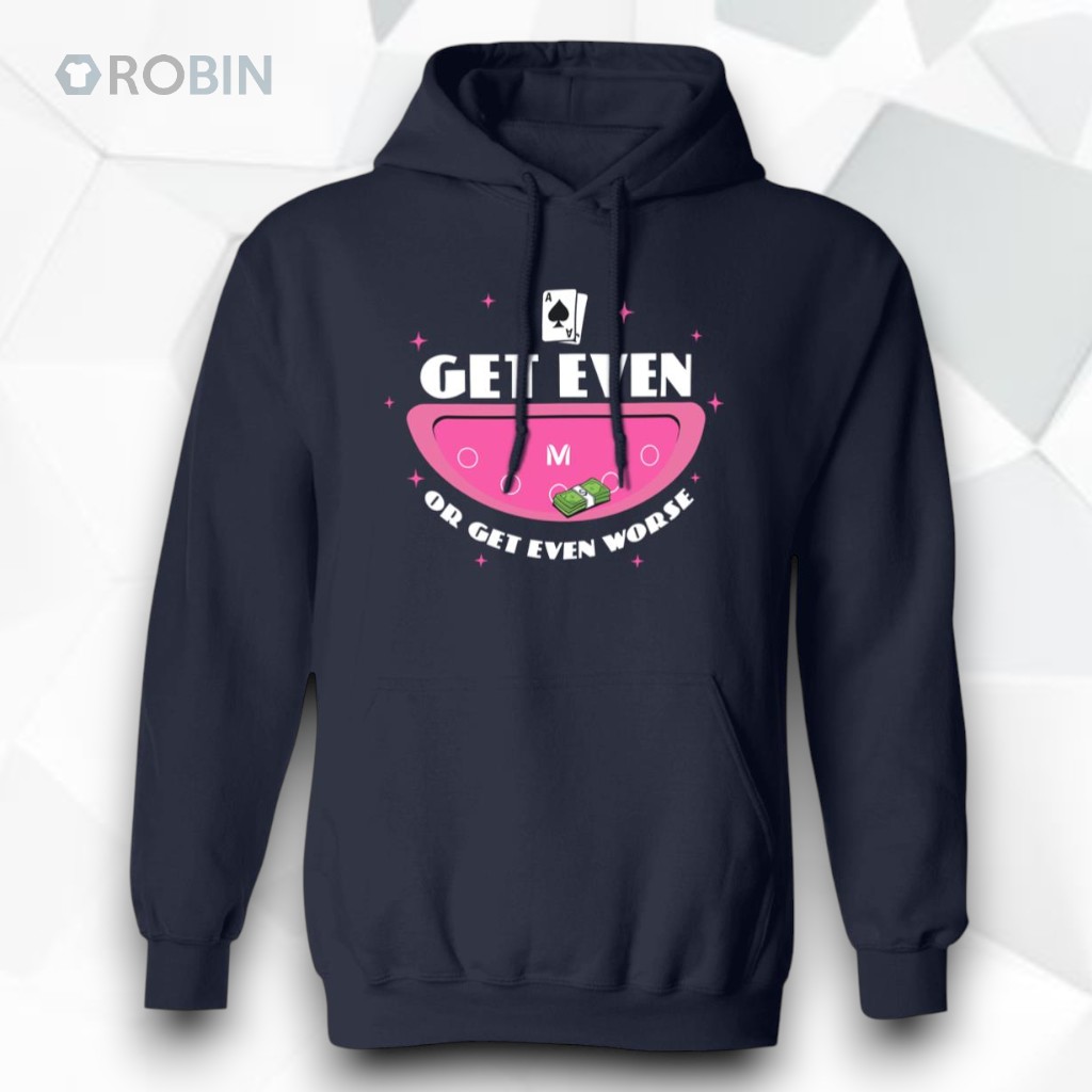 There’s a certain thrill in striking the perfect balance between daring and playful, and that’s exactly the energy this hoodie channels. The bold typography, all caps and blocky, slaps across the chest like a cheeky manifesto—“Get Even”—punctuated with a splash of vivid pink that effortlessly captures the eye. It’s impossible to miss the iconic pink poker chip positioned alongside a scatter of playing cards and fluttering dollar bills, symbols that don’t just hint at a gambling vibe but celebrate the high-stakes attitude many young adults wear as a badge of honor. The layout is both retro and fresh, like a vintage arcade poster updated for a new generation who knows how to blend edge with humor. Each element is meticulously placed to create a balanced visual punch, with the white text contrasting sharply against the deeper fabric tones, making a statement loud and clear: playing it safe isn’t in this game. The design proudly flouts subtlety, appealing to those who enjoy a twist of rebellion without losing that casual cool. This is the kind of piece that resonates with people who live for social nights where a few playful wagers are thrown around, or lazy weekends when comfort pairs with conversation starters. Friends who appreciate a sharp wit and love a bit of cheeky gambling humor would definitely get a kick out of wearing this. Beyond daily wear, it’s a collector’s item for anyone drawn to bold graphics with a narrative—an unspoken testament to the joy of taking chances and, if necessary, getting even.