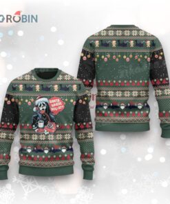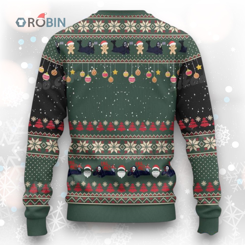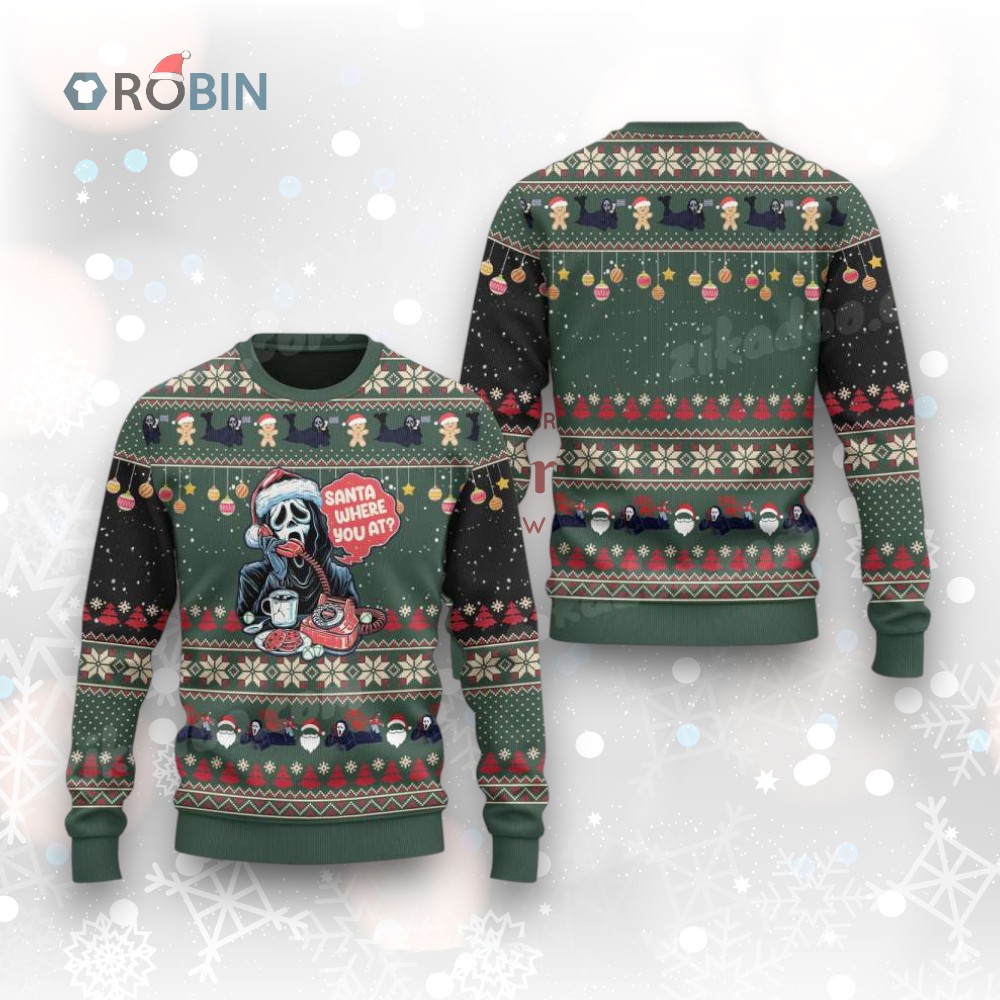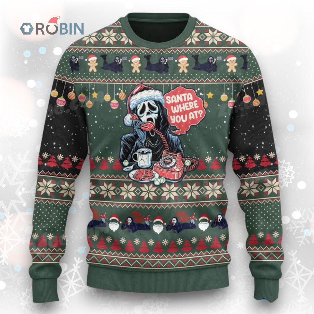 Imagine Ghostface dialing up Santa for a holiday twist! This playful sweater blends the spirit of Christmas with a touch of spooky humor. The design features Ghostface rocking a Santa hat, phone in hand, and a feast of festive treats. It's perfect for adding a cheeky grin to your holiday gatherings. Ready to make everyone smile? Grab yours and join the festive fun!